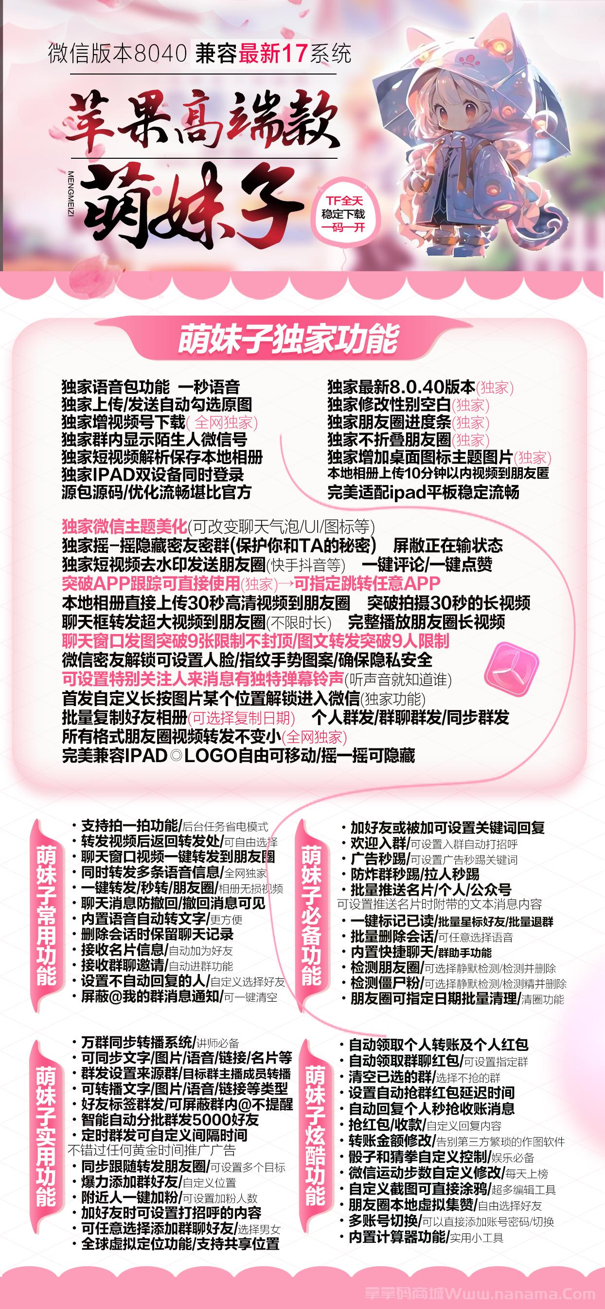 苹果高端款萌妹子微信版本8040兼容最新17系统,全天稳定下载。独家语音包功能,一秒语音,朋友圈进度条独家功能,独家群内显示陌生人微信号,不折叠朋友圈,独家短视频解析保存本地相册,一键评论一键点赞,突破APP跟踪可直接使用,可指定跳转任意APP。个人群发群聊同步群发,可设置广告秒踢关键词,同时转发多条语音信息全网独家,可设置关键词回复加好友,可设置屏蔽@我的群消息通知一键清空。接收名片信息自动加为好友,抢红包收款自定义回复内容,定时群发可自定义间隔时间。转播文字图片语音链接等类型,转账金额修改告别第三方繁琐的作图软件。不错过任何黄金时间推广广告,爆力添加群好友自定义位置,朋友圈本地虚拟集赞自由选择好友。内置语音自动转文字更方便,智能自动分批群发5000好友。