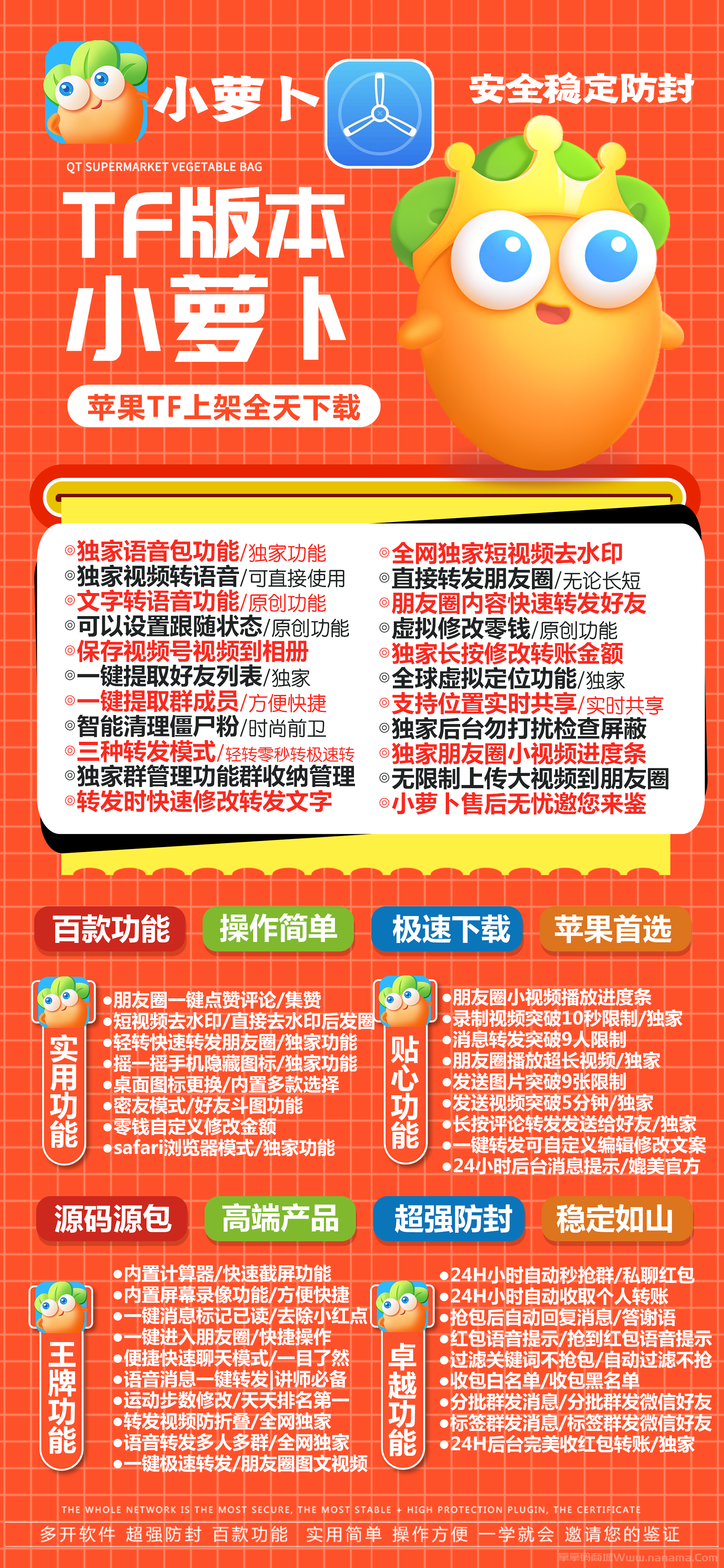 除此之外,苹果小萝卜还具备许多其他独家功能,如一键转发朋友圈小视频进度条、一键提取群成员、智能清理僵尸粉、后台勿打扰检查屏蔽、三种转发模式、快捷操作等。这些功能让您的社交体验更加便捷和高效。