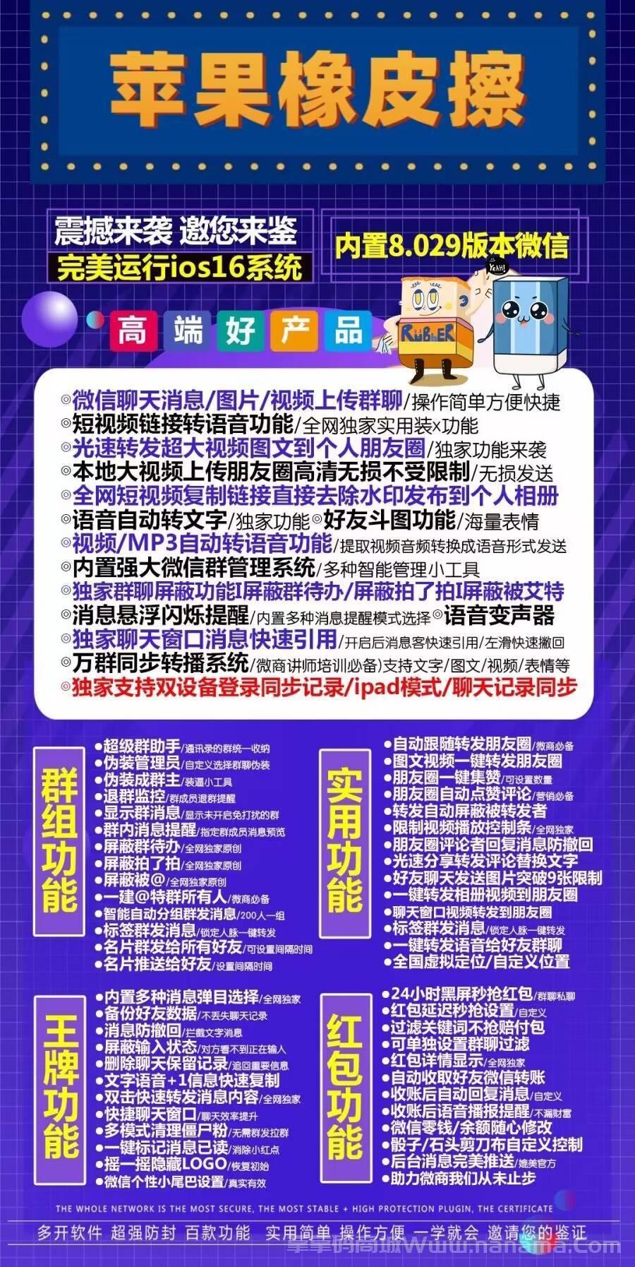 苹果橡皮擦内置8.029版本微信,完美运行ios16系统。这是一款高端好产品,具备多项出色功能。首先,它提供了微信聊天消息、图片和视频上传至群聊的功能,操作简单方便快捷。而且,还拥有短视频链接转语音的实用功能,这是全网独家的特色之一。此外,它能够光速转发超大视频和图文至个人朋友圈,这是一项独家功能的福利。在发送本地大视频至朋友圈时,它能够保持高清无损,甚至不受任何限制,大大提升了用户体验。