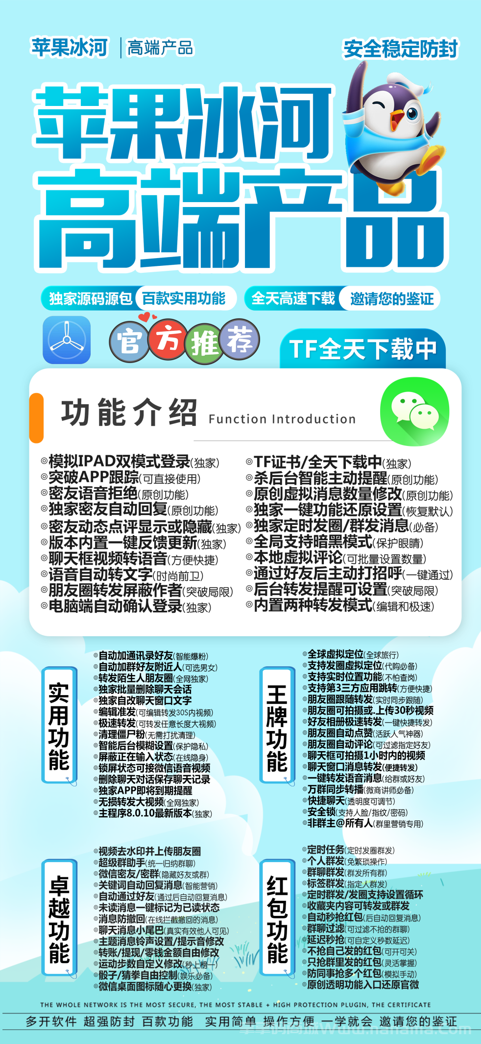 苹果冰河微信多开一键转发软件,是一款高端产品,为您提供安全稳定防封的使用体验。它以独家源码源包为支撑,拥有百款实用功能,满足您的多重需求。不仅如此,它还具备全天高速下载的能力,为您提供极致便利。