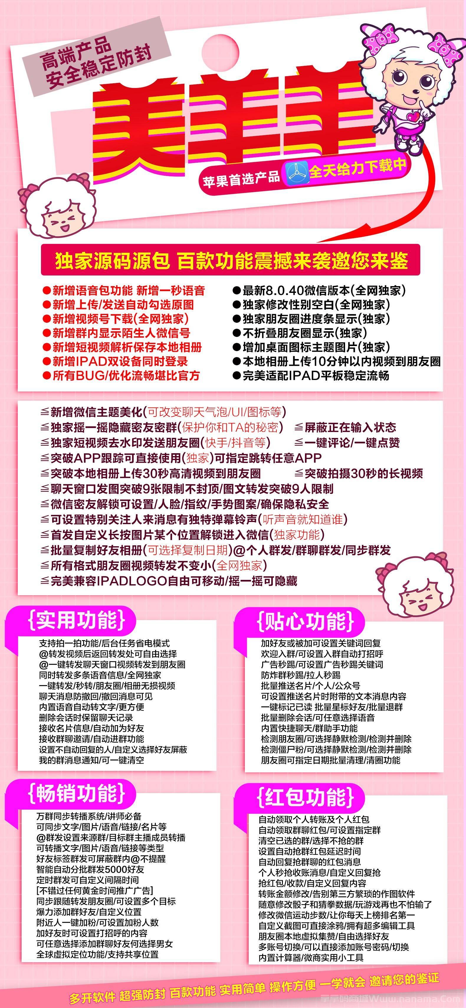 苹果美美羊,一款高端产品,提供安全稳定的防封功能,全天给力的下载速度。作为苹果用户的首选产品,我们提供独家的源码源包和百款功能,为您带来震撼的体验。我们新增了语音包功能,让您能够一秒语音沟通。最新的8.0.40微信版本是全网独家,新增了上传/发送自动勾选原图的功能。我们独家修改了性别空白,该功能在全网独家。此外,我们还新增了视频号下载、朋友圈进度条显示、群内显示陌生人微信号等功能。我们的产品还支持不折叠朋友圈显示,并新增了短视频解析保存到本地相册的功能。此外,我们还增加了桌面图标主题图片,并实现了IPAD双设备同时登录。您可以将本地相册中的10分钟以内的视频上传到朋友圈分享。我们的产品不仅修复了所有的BUG,还进行了优化,保证了流畅的使用体验,堪比官方版本。同时,我们完美适配了IPAD平板设备,保持了稳定流畅的性能。我们还新增了微信主题美化功能,让您可以自定义聊天气泡、图标等。为了保护您和TA的秘密,我们独家推出了摇一摇隐藏密友密群的功能。此外,我们还屏蔽了正在输入状态,让您能够更加放心地聊天。我们的产品还支持独家短视频去水印发送到朋友圈(支持快手、抖音等平台的视频)。您还可以一键评论、一键点赞,我们的产品突破了APP跟踪,可以直接使用,并且能够指定跳转到任意APP。您可以上传30秒高清视频到朋友圈,并且能够拍摄长达30秒的视频。在聊天窗口发图时,我们突破了9张限制,并且解除了图文转发的9人限制。为了保障您的隐私安全,我们提供了微信密友解锁的功能,支持人脸、指纹和手势图案等多种解锁方式。此外,您还可以为特别关注的人设置独特的弹幕铃声,一听声音就知道是谁发来的消息。我们还首次推出了自定义长按图片某个位置解锁进入微信的独家功能。您可以批量复制好友相册,并选择复制的日期。所有格式的朋友圈视频转发不会变小,这也是全网独家的功能。我们的产品完美兼容IPAD,LOGO可以自由移动,并且通过摇一摇可以隐藏。