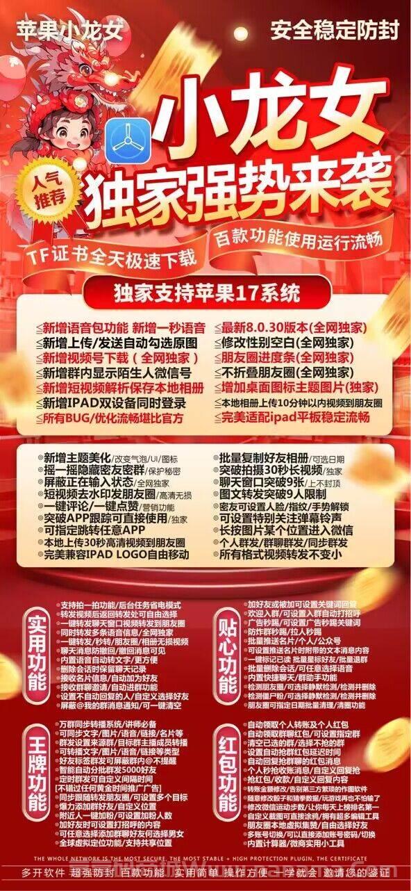 #小龙女 #苹果微信多开转发 #防封 #TF证书 #极速下载 #独家功能 #个性化体验 #语音包 #高清视频 #突破限制 #自由高效 #安全稳定