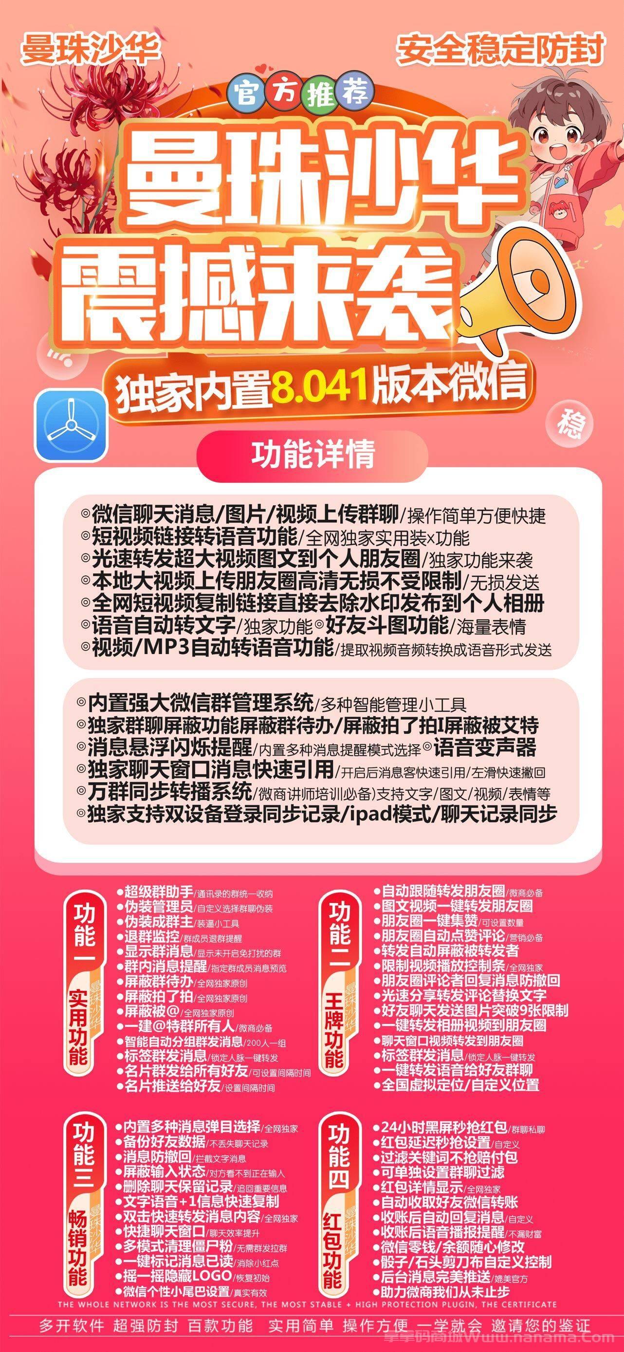 苹果曼珠沙华是一款苹果微信多开应用,具备安全稳定的特点,可以有效防封。官方推荐,给你带来震撼的体验。该应用独家内置微信版本8.041,提供了丰富的功能。你可以通过它进行微信聊天消息、图片和视频的上传,以及进行群聊和其他简单、方便、快捷的操作。此外,它还具备短视频链接转语音功能,全网独家实用的装X功能,以及光速转发超大视频图文到个人朋友圈等功能。使用它,你可以在朋友圈高清无损地上传大视频,无需受到任何限制,还可以直接复制链接去除水印并发布到个人相册。它还提供语音自动转文字的独家功能,以及好友斗图功能和海量表情。你可以将视频和MP3文件自动转换成语音形式进行发送,同时内置强大的微信群管理系统,提供多种智能管理小工具。独家的群聊屏蔽功能可以屏蔽群待办、屏蔽拍了拍和屏蔽被艾特等。还有消息悬浮闪烁提醒功能,可以选择不同的消息提醒模式,支持语音提醒。快捷引用聊天窗口消息的功能,开启后可以快速引用消息并进行左滑快速撤回操作。该应用还提供万群同步转播系统,对于微商讲师培训来说是必备工具,支持文字、图文、视频和表情等不同形式的信息发送。你还可以实现双设备登录同步记录,使用iPad模式,并且可以自动收纳通讯录中的群组。通过该应用,你可以自动跟随转发朋友圈,实现伪装管理员、自定义选择群聊伪装的功能,还可以一键转发图文视频到朋友圈,并伪装成群主使用。实现朋友圈一键集赞,设置数量并监控群成员退群提醒。在朋友圈自动点赞评论方面,它是营销的必备工具,还可以显示群消息和显示未开启免打扰的群的功能。转发时自动屏蔽被转发者,可以设置群内消息提醒和指定群成员消息预览。此外,它还提供限制视频播放控制条和屏蔽群待办的全网独家原创功能。对于朋友圈评论者回复消息防撤回和屏蔽拍了拍方面,也是全网独家原创。通过该应用,你可以突破好友聊天发送图片9张的限制,并@特定群所有人,实现一键转发相册视频到朋友圈,智能自动分组群发消息(每组200人),将聊天窗口视频转发到朋友圈,并使用标签群发消息锁定人脉并一键转发。此外,它还提供名片发给所有好友可间和一键转发语音给好友群聊的功能。虚拟定位功能可以实现全国范围内的自定义位置。内置多种消息弹目选择的功能也是全网独家的。在红包秒抢方面,它提供了24小时黑屏秒抢红包的功能,可用于群聊和私聊。你还可以备份好友数据,避免丢失聊天记录,设置红包延迟秒抢以及消息防撤回和过滤关键词不抢赔付包等功能。它还提供了屏蔽输入状态、可单独设置群聊过滤和删除聊天保留记录追回重要信息的功能。红包详情显示是全网独家的功能之一。同时,该应用还提供了文字语音+1信息快速复制、自动收取好友微信转账、双击快速转发消息内容等功能。在收账后自动回复消息和快捷聊天窗口方面,可以提升聊天效率。为了防止财富流失,它还提供收账后语音播报提醒功能。