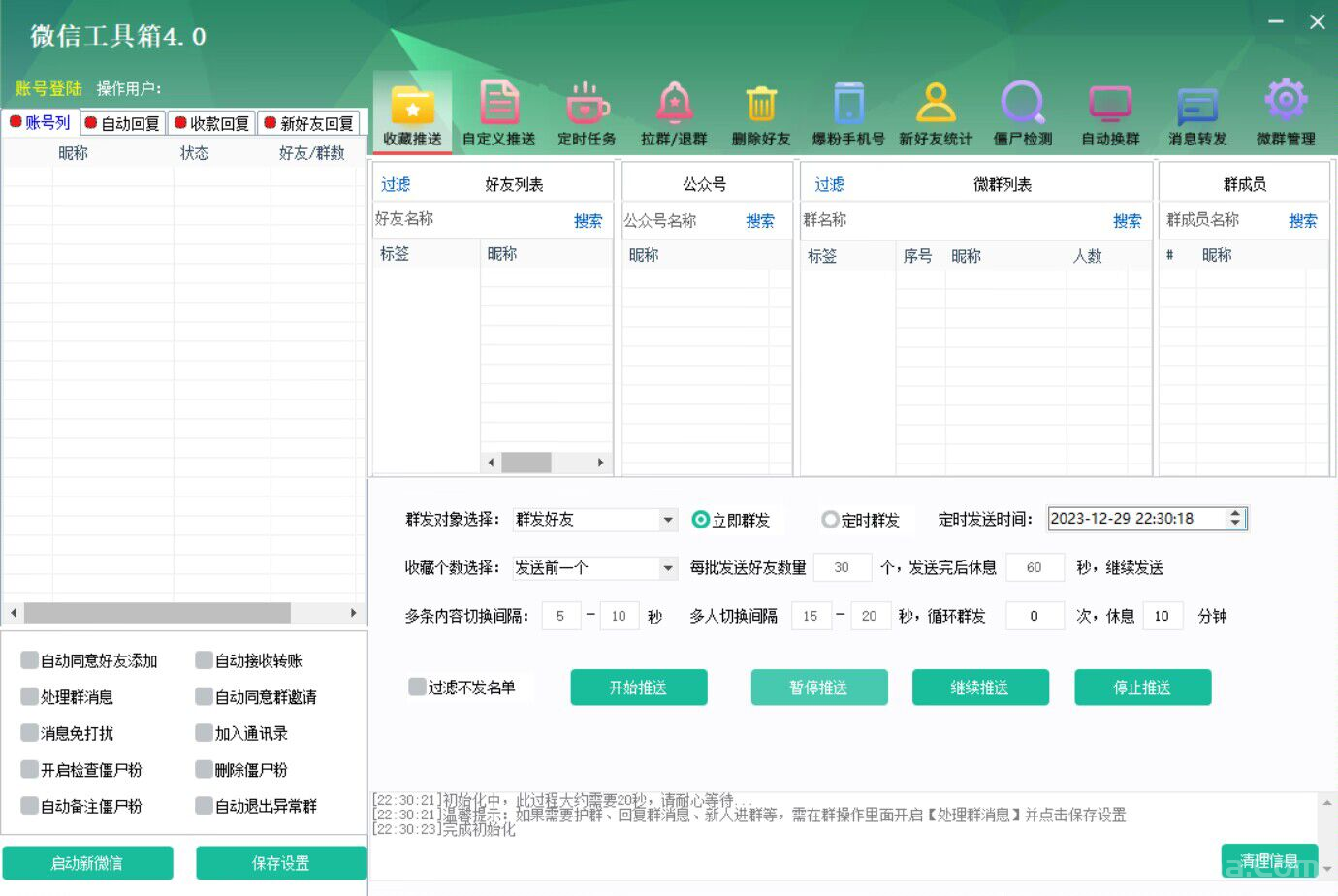1、群发功能:收藏群发,自定义群发,支持群发文字、图片、视频、名片、公众号、文章、小程序等等,可立即群发,定时群发,循环群发