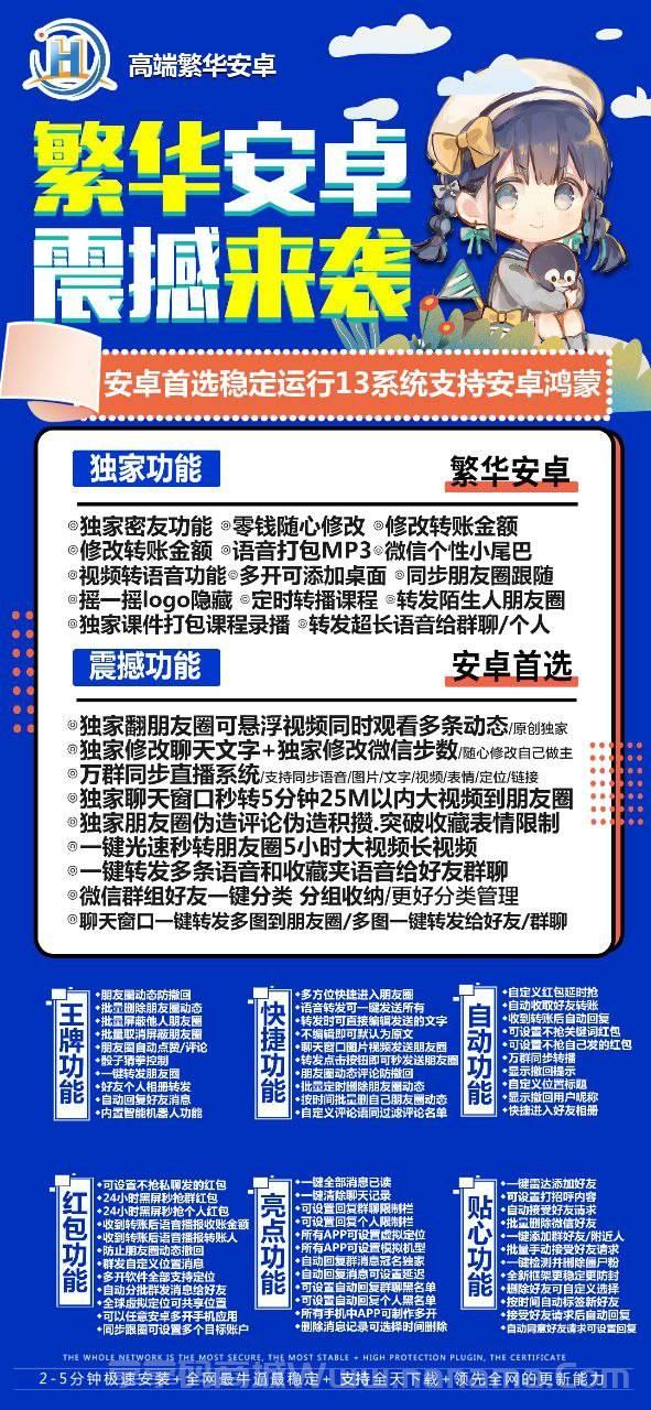 繁华安卓是一款专为安卓平台开发的微信多开软件,具备稳定运行的特点,支持安卓鸿蒙操作系统。该软件独具密友功能,用户可自由修改和转账金额,并可以将转账金额语音打包为MP3格式和个性化的微信小尾巴。此外,该软件还具备视频转语音功能和多开功能,用户可以添加桌面同步朋友圈和摇一摇logo隐藏功能,还可定时转播课程和转发陌生人朋友圈。软件独家提供课件打包功能,可以录播和转发超长语音给群聊或个人。用户还可以独家翻朋友圈并悬浮观看多条动态和原创内容,同时可以修改聊天文字和微信步数来实现个性化修改。软件支持万群同步直播系统,可同步语音、图片、文字、视频、表情、定位和链接。聊天窗口还可秒转大视频到朋友圈,朋友圈还可以伪造评论和积攒突破收藏表情的限制。一键光速秒转朋友圈5小时大视频和长视频,一键转发多条语音和收藏夹语音给好友和群聊。该软件还具备微信群组好友一键分类分组和收纳,更好地分类管理好友。聊天窗口可以一键转发多图到朋友圈或一键转发多图给好友和群聊。朋友圈动态防撒回功能可确保动态内容的安全性,且用户可以通过多种方式快捷进入朋友圈。此外,还提供自定义红包延时抢功能、批量删除朋友圈动态功能、语音转发功能和自动收取好友转账功能。用户还可以批量屏蔽他人朋友圈、转发时直接编辑发送的文字、收到转账后自动回复、批量取消屏蔽朋友圈等功能。此外,用户还可以设置不抢关键词红包、自动点赞和评论朋友圈动态、在聊天窗口直接发送图片和视频到朋友圈,以及设置不抢自己发的红包、控制殷子猜拳等功能。用户可以通过一键点击按钮快速发送朋友圈,也可以一键转发朋友圈。朋友圈动态评论防撤回功能可显示撤回提示,并支持好友个人相册转发。用户还可以批量查找和定时删除朋友圈动态、自定义位置标题、按时间批量删除自己的朋友圈动态,显示撤回用户昵称等功能。此外,软件内置智能机器人功能,可以自定义评论语和评论名单,还能快捷进入好友相册。用户还可以设置不抢私聊发的红包、批量删除微信好友、收到转账后语音播报转账人、设置虚拟定位等功能。软件支持一键添加群好友和附近人,防止朋友圈动态撒回,模拟机型设置,批量手动接受好友请求,群发自定义位置消息等功能。此外,软件还具备自动回复群消息的功能,可以设置延迟回复时间,还能检测恶意软件,全新框架更加稳定且防封,自动分批发送消息给好友,并支持设置自动回复群聊黑名单。用户还可以根据需要划除好友,并可共享虚拟定位。此外,还可以设置自动回复个人消息的黑名单,按时间自动标记新好友,以及任意安卓多开手机应用。