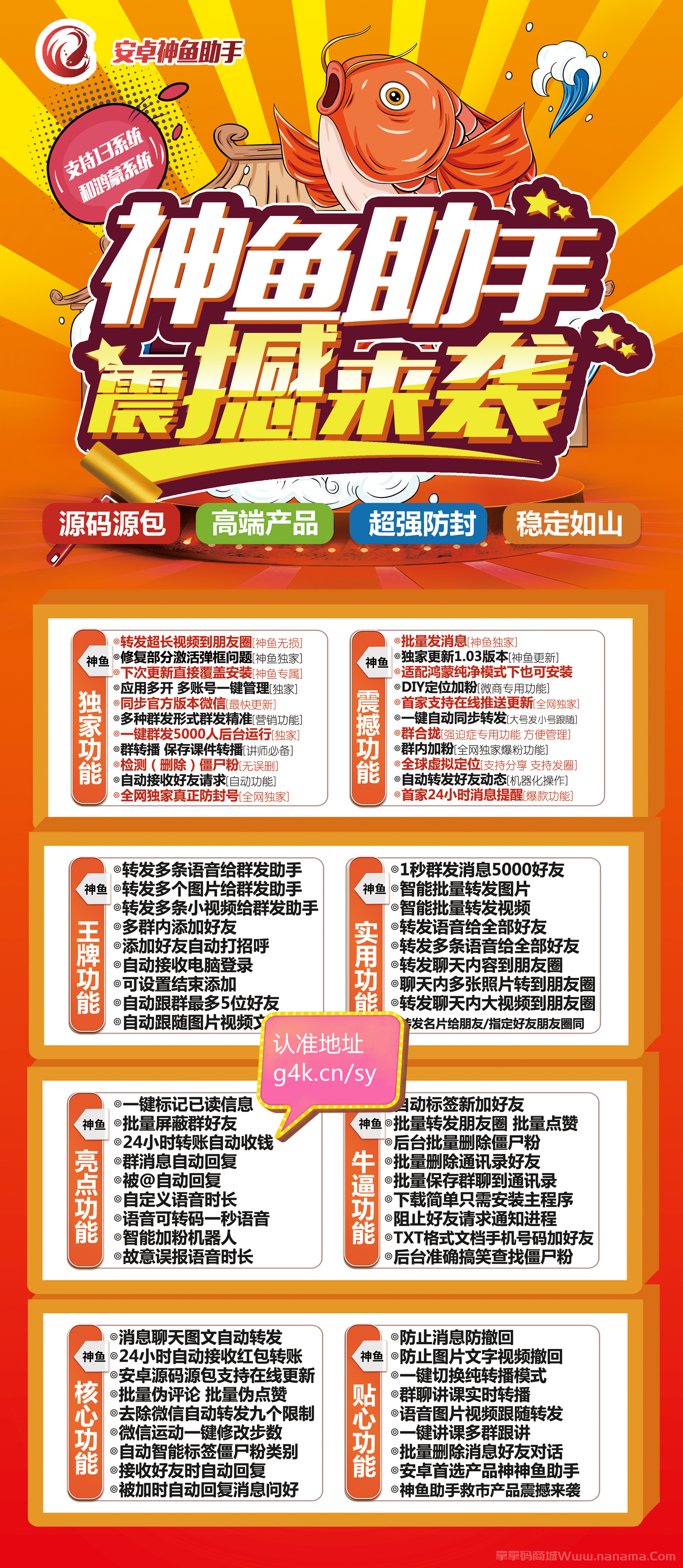 安卓神鱼助手是一款专为安卓微信多开而设计的软件。其支持13个系统,包括鸿蒙系统。该软件具备多项强大功能,例如将超长视频转发到朋友圈(神鱼无损),实现批量消息发送(神鱼独家),修复了一些激活弹框问题(神鱼独家),并独家推出了1.03版本的更新(神鱼更新)。用户可以直接覆盖安装来进行下一次更新(神鱼专属)。此外,它还适配了鸿蒙纯净模式,使得用户可以在这种模式下安装和应用多开多账号一键管理的功能(独家)。针对微商用户,该软件还提供了DIY定位加粉的功能。另外,它能够同步官方版本的微信,并成为首个支持在线推送更新的软件(全网独家)。用户可以一键自动同步转发消息,使得大号发消息,小号跟随,同时还可以选择多种群发形式来实现精准群发(营销功能)。该软件还提供了一键群发5000人的后台运行功能(独家),以及群合拢功能(方便管理)。对于讲师来说,群转播和保存课件转播的功能是必备的。此外,该软件还拥有全网独家的群内加粉功能,可以检测和删除僵尸粉(无误删)。还有全球虚拟定位功能,支持分享和发圈。自动接收好友请求和自动转发好友动态则是该软件的自动化操作功能之一。值得一提的是,它也是全网独家提供真正防封号的软件。此外,它还可以进行24小时消息提醒(爆款功能)。用户可以通过将多条语音转发给群发助手,一秒内向5000个好友群发消息;或者将多个图片转发给群发助手,实现智能批量转发图片;还可以将多条小视频转发给群发助手,进行智能批量转发视频。同时,它也支持在多个群内添加好友、将语音转发给全部好友、自动打招呼、将多条语音转发给全部好友、自动接收电脑登录、将聊天内容转发到朋友圈等功能。用户可以设置结束添加,将聊天内的多张照片转到朋友圈,自动跟随最多5位好友,将聊天内的大视频转发到朋友圈等。此外,它还具备自动跟随转发图片、视频和文本的功能。该软件还可以专发名片给朋友或指定的好友,以及一键标记已读信息、自动标签新添加的好友、批量屏蔽群好友、批量转发朋友圈和批量点赞的功能。如果用户需要,它还提供24小时自动收钱的转账功能,以及后台批量删除僵尸粉、群消息自动回复、批量删除通讯录好友、被@时自动回复、批量保存群聊到通讯录、自定义语音时长等功能。使用该软件下载简单,只需安装主程序,同时它还支持一秒语音转码的功能。此外,它还能够阻止好友请求通知进程、提供智能加粉机器人、通过TXT格式文档中的手机号码添加好友、故意误报语音时长以及后台准确搞笑查找僵尸粉等功能。用户还可以实现消息、聊天、图文的自动转发,防止消息防撤回,实现24小时自动接收红包和转账,以及防止图片、文字和视频的撤回。安卓神神鱼助手还提供安卓源码源包,支持在线更新。用户还可以通过一键切换纯转播模式、批量伪评论和批量伪点赞的功能来实现群聊讲课的实时转播。另外,它还能去除微信自动转发的九个限制,实现语音、图片和视频的跟随转发。此外,它还提供了微信运动一键修改步数的功能,以及一键讲课多群跟讲的功能。不仅如此,该软件还具备自动智能标记僵尸粉类别、批量删除消息和好友对话、自动回复接收好友时的消息、安卓首选产品等众多功能。安卓神神鱼助手是解决救市的产品,为用户带来了震撼的体验。